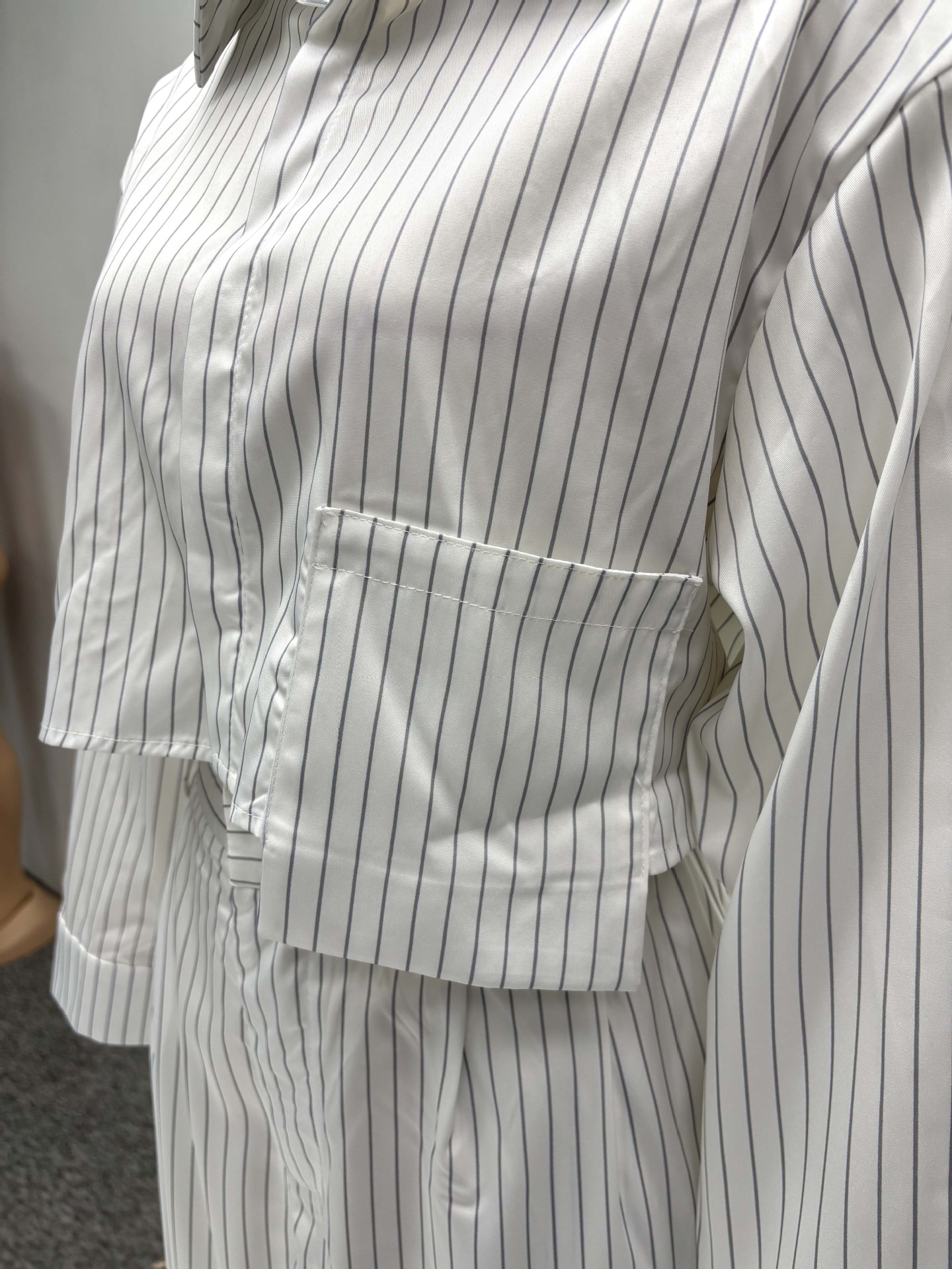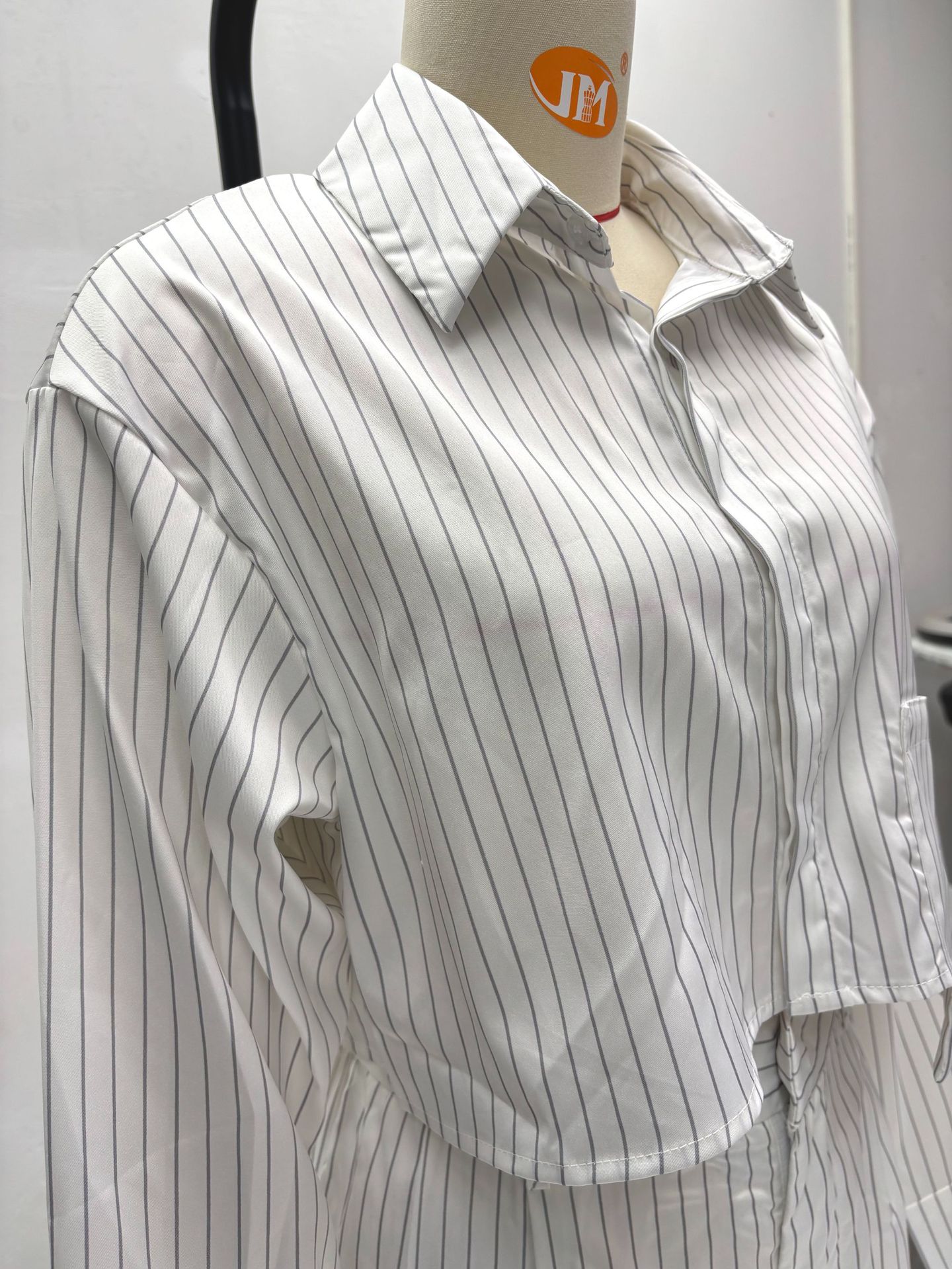 Chemise à col tailleur : coupe droite, manches longues, rayures verticales pour un effet amincissant.