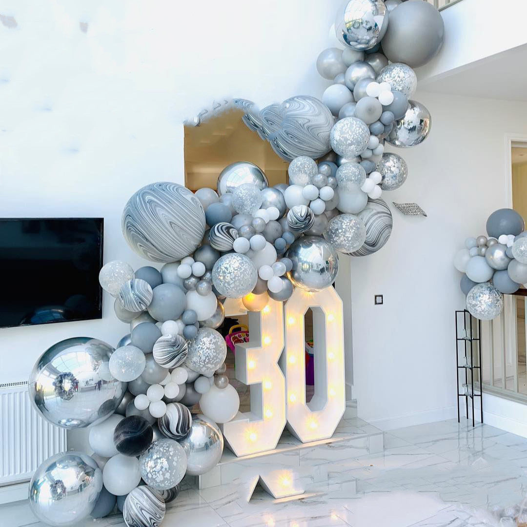 Un ensemble de ballons aux teintes élégantes (gris, blanc, noir, argent métal et argent à sequins), idéal pour créer une arche moderne et raffinée. Parfait pour les anniversaires, mariages, soirées chics ou décorations thématiques noir & argent.